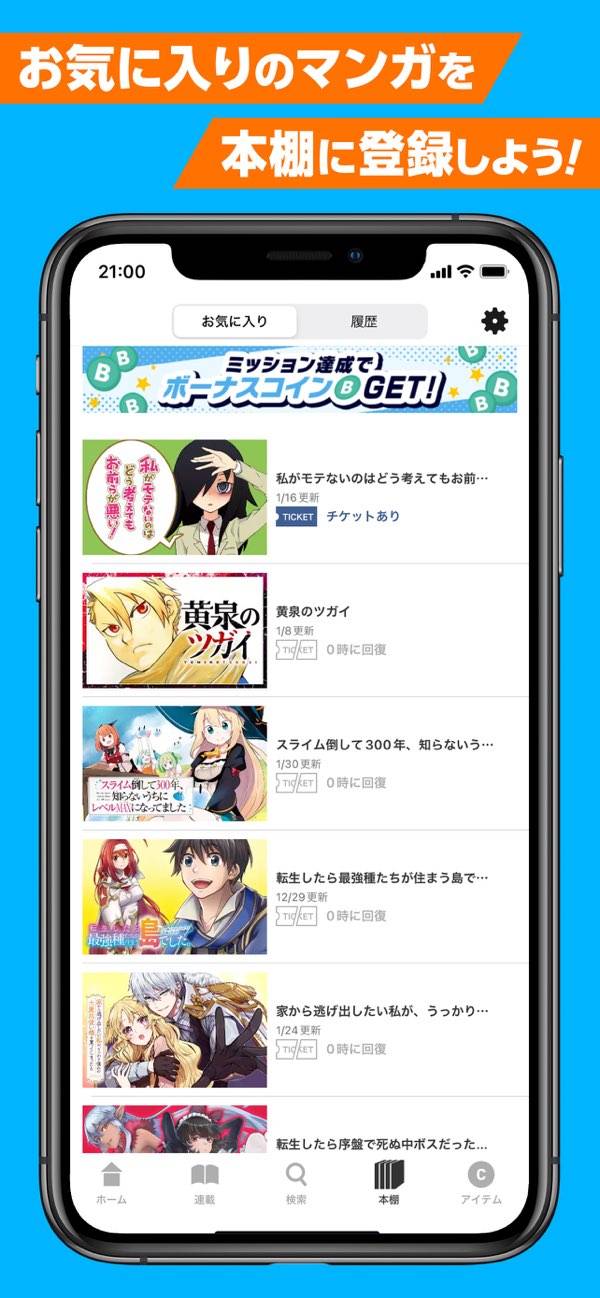 お気に入り登録で自分だけの本棚を作り、最新刊の確認も簡単。さまざまなジャンルの漫画がそろっているので、新しい作品との出会いも期待できます。