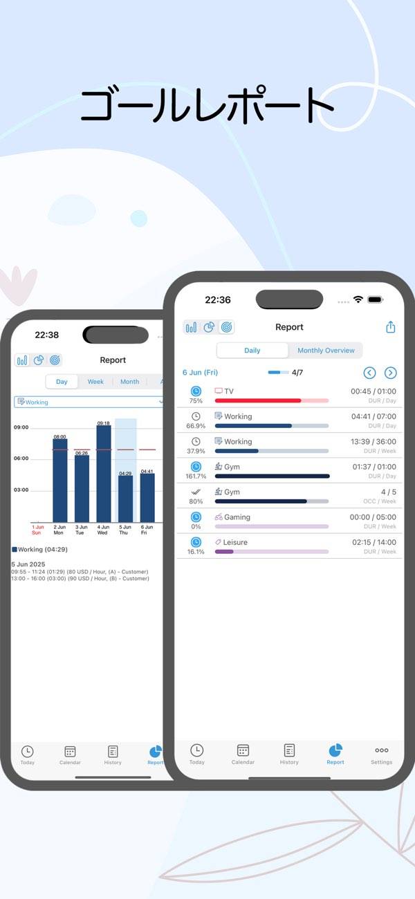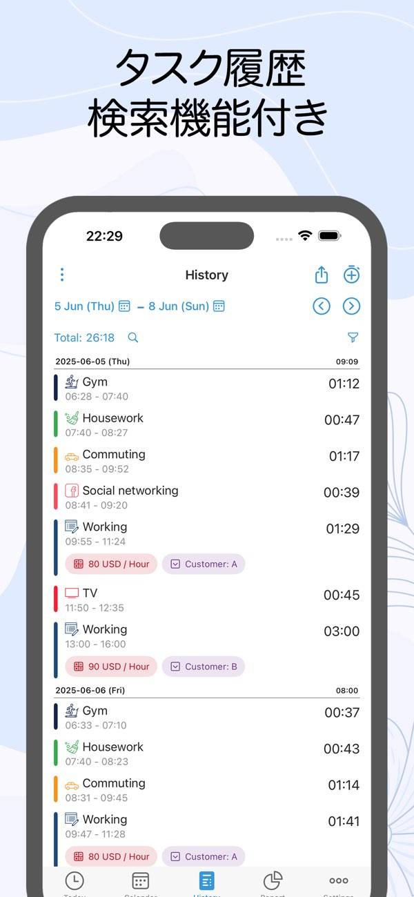 タスクにかかる時間を1タップで計測開始できるアプリ。新規タスクの登録や予約はもちろんのこと、カレンダーでいつ何をしたかがひと目でわかるのも魅力。また、期間を指定して、どのタスクにどれくらい時間を使っているかを可視化できます。