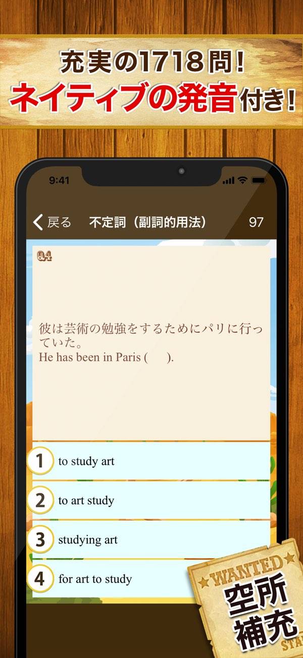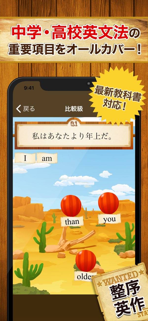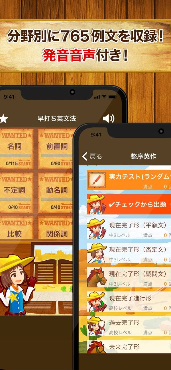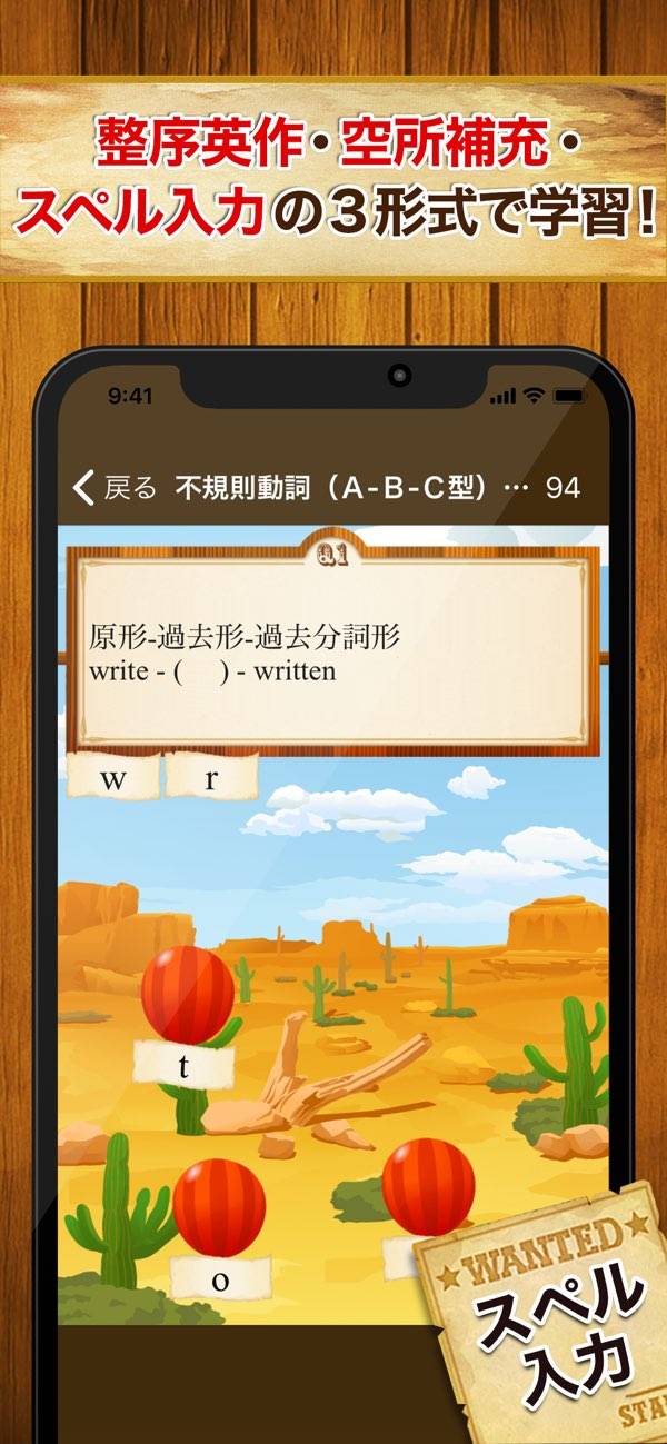 一問一答や語順の選択など、さまざまな英語の問題を用意。いずれも画面タップで回答できるためお手軽で、通学中などでも勉強しやすいでしょう。西部劇をモチーフにしたユニークな演出も、抵抗感を薄れさせてくれます。