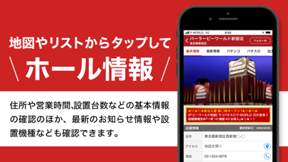 遊びに行きたいパチンコ店を探す手間を省ける便利なアプリです。現在地周辺の店舗を簡単に検索し、リアルタイムで最新の情報をチェック可能。また、好きな店舗やエリアのフォローもでき、自分の知りたい情報だけを確認できます。近くのパチンコ店を探したり、その店舗の情報を確認したりしたい人に最適です。