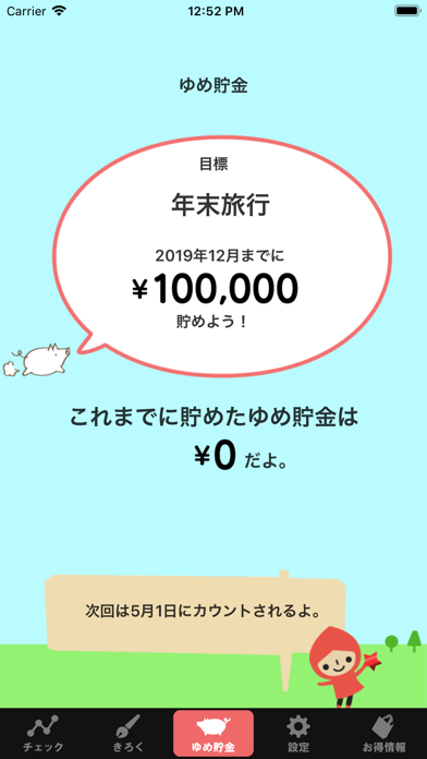 夢貯金があると、やりくり頑張りたくなりますよね(^ ^)キャラも可愛いし、実際、夢というか欲しい物があるから、それに向けて頑張れる。楽しくやりくりしたい方オススメです