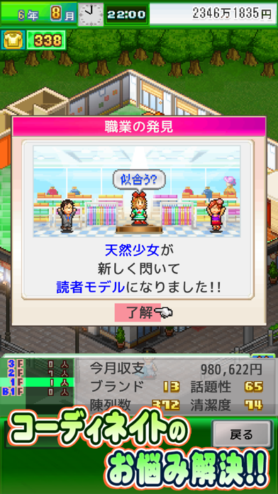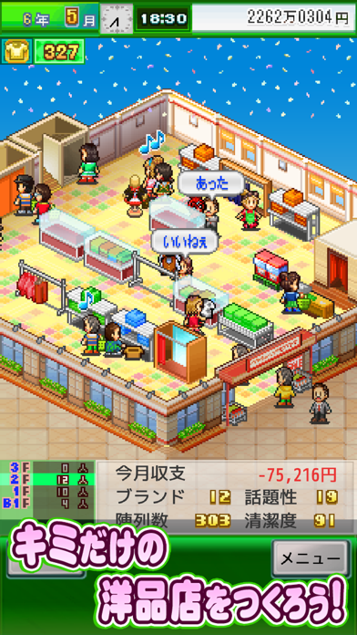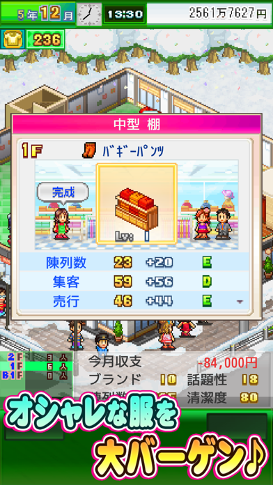 今回も他のシミュレーションゲーム同様、お手軽操作とどこかレトロなデザインは顕在。基本はタップまどで簡単に進めることが出来ます。商品の陳列からスタートし、お客さんの層や季節、流行などを見極めつつ、仕入する商品を決め、売上をアップさせていきます。配置の組み合わせや景気、天気に応じて品揃えを変えていくという経営戦略が楽しめるのもポイントです。