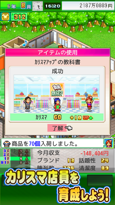 雇用すれば、お店の清潔度やセンスがアップし、更に客足は増えます。トロフィーの獲得や、お店のランキングアップなど、目に見えて成長していく達成感はひとしお。カイロソフトファンならずとも一度プレイしたらやみつきになるアプリです。