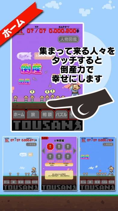 『倒産力』なるなんとも物騒な力を駆使して、世界各地の様々な人々や会社を『幸せ』に導くシミュレーションゲーム。人々を幸せにすると『幸』が手に入り、その幸をさらに用いてより多くの人々を幸せに導く。倒産といえばどうしても暗いイメージが付きまとう。しかし、このアプリで価値観が変わるかも?