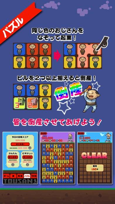 パズルモードはけっこうランダム性が高いんですが、何も考えず消してるとまず高スコアはでません。かといって、まとめて大量のおじさんを処分すればいいかと言えばけしてそうでもなく、おじさんをそれなりに消しつつもいかに大量の会社を同時に倒産に追い込むかがキーになります。
