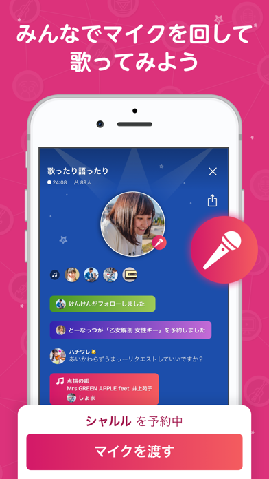 LIVE機能搭載でリアルタイムの音楽配信が行えるアプリです。最大6人まで同時に、歌やおしゃべりを楽しむことができます。お気に入りのBGMを流しながらの会話は、盛り上がること間違いなし! ほかのユーザーとのより深い交流が楽しめますよ。