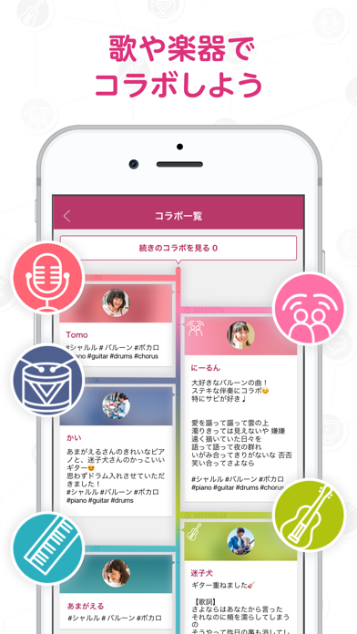 ほかのユーザーとのコラボを楽しむことが可能です。投稿されたサウンドに自分の歌をのせたり、楽器演奏を重ねたりできます。さらに、「画像コラボ」機能搭載で、サウンドにイラストや写真を添付することも! 視覚的な表現も加えられ、個性的な投稿が可能です。
