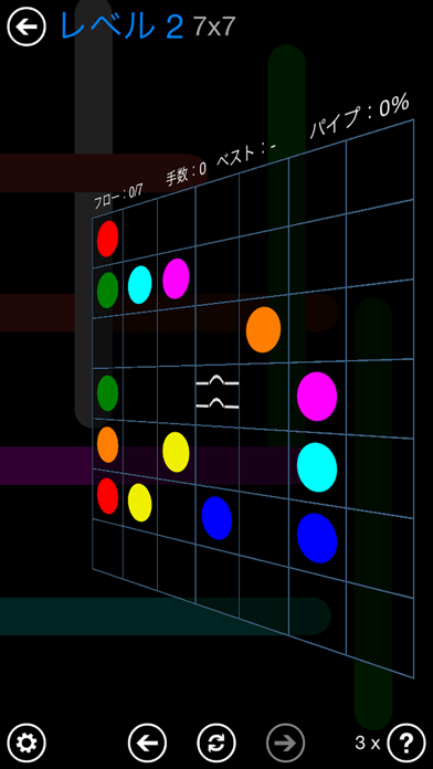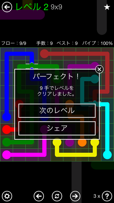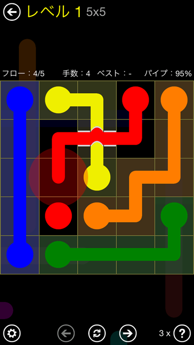 同じ色の点を線でつなげていくというナンバーリンクパズルです。一般的なナンバーリンクパズルは線を交差させることができませんが、各ステージにひとつだけある橋を利用して交差させることで一味違ったナンバーリンクパズルを楽しめます。