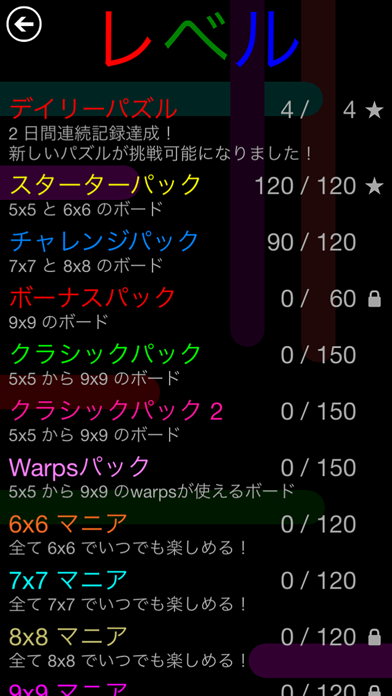 ステージは「Starter Pack」と「Challenge Pack」が各120ステージあり、さらに「Bonus Pack」60ステージ、「Classic Pack」150ステージ、「7x7 Mania」120ステージが用意されていてボリューム満点。Starter Packの序盤はスラスラと解ける問題が多くありますが、次第に難易度が上がり、じっくりと考えなければ解けない問題へと進んでいきます。