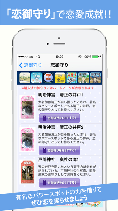 全国のパワースポットの写真を恋愛守りとして、待ち受け画面にできます。「行きたいけど遠い」「時間がない」という人におすすめ。パワースポットは約20種類用意されており、お守りにしたい場所を選ぶだけでOKです。
