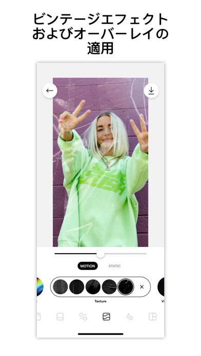 このアプリには画像編集ツールも備わっています。フィルターや美肌加工、コントラストや明るさの調整など、一通りの編集が可能。背景削除やオーバーレイなど一部の機能が有料なのが残念ですが、ちょっとした加工を行うには十分でしょう。