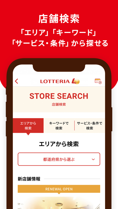 - 現在位置から近くの店舗を検索可能。モバイルオーダーで並ばず受け取り