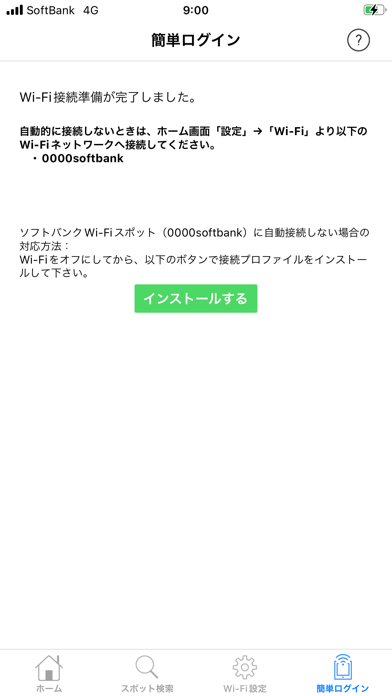 設定を変更しておけば、ソフトバンクWi-Fiに自動接続できます。画面下部の「簡単ログイン」をタップして、接続プロファイルをインストールしておきましょう。インストールが終わると、アプリを開かなくてもWi-Fiに自動接続できるようになります。