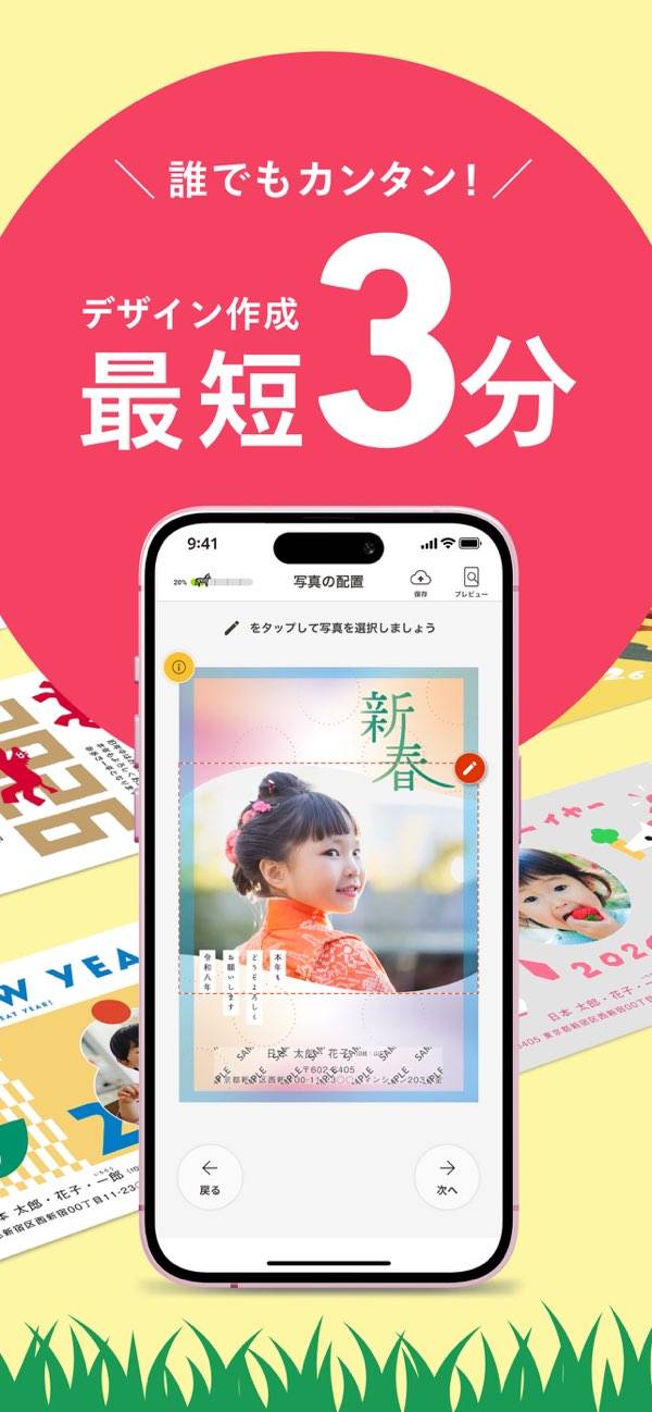 デザイン選びから印刷・配送の手配までスマホだけで完結する年賀状作成アプリです。定番からキャラもの、写真入りまでテンプレート豊富で、複数種類をまとめて注文することも可能。宛名印刷や投函代行も無料で利用でき、自宅にプリンターがなくても簡単に年賀状が送れます。