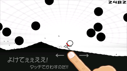 棒人間を右に左に指で操作して落ちてくる丸い岩を避けていくだけ。一度でも岩にあたってしまうとゲームオーバーという厳しいルールですが、制限時間が無いのであたりさえしなければエンドレスでプレイ出来ます。