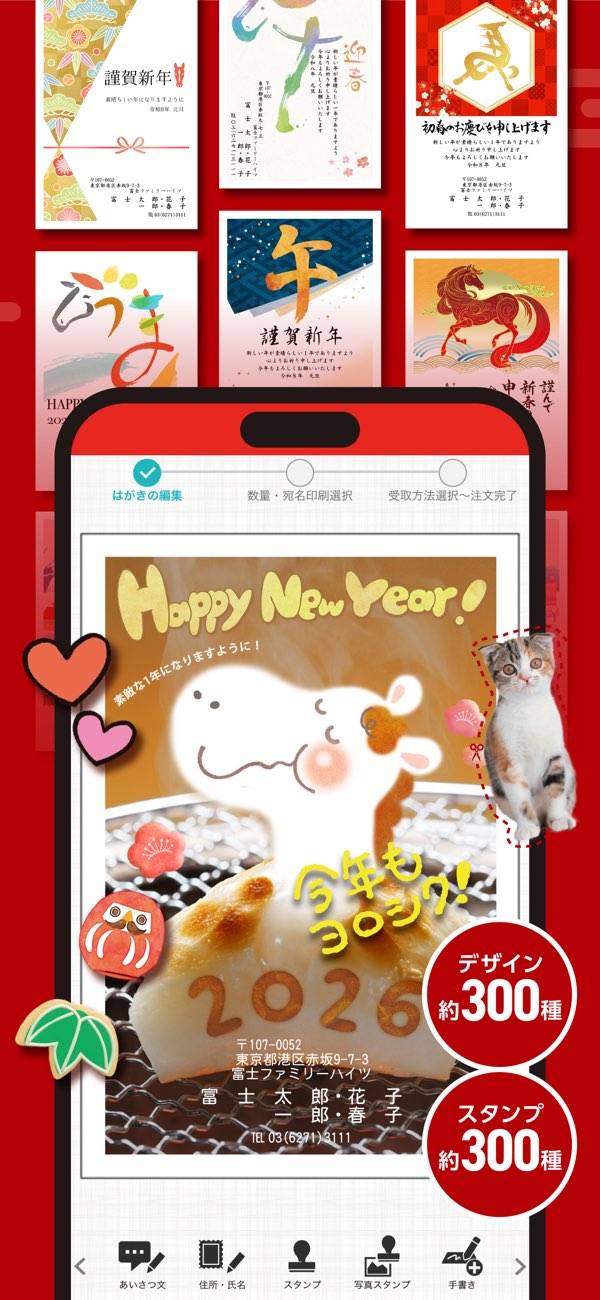 - 好きなデザインとスタンプを組み合わせて、オリジナル年賀状を簡単作成