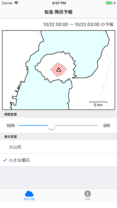 - 約9時間後までの降灰予想が確認できて時間ごとの変化もわかる