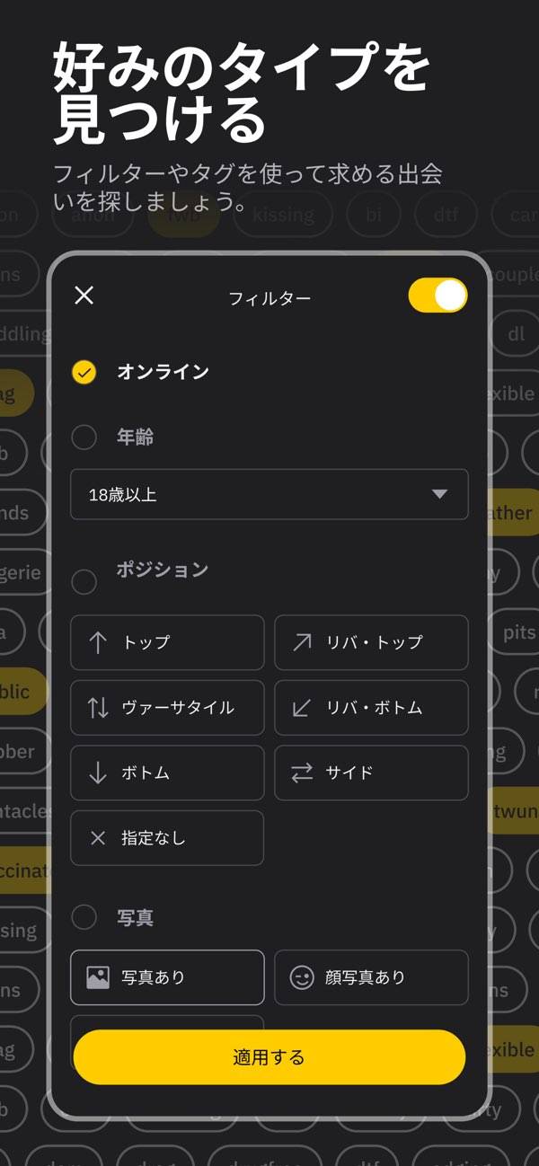 オンライン中や身長・体重・希望の特徴などをフィルター機能で絞り込めます。相手に求める条件を設定しすぎると、表示される件数が少なくなるため注意してください。どうしても妥協できない条件のみを設定し、フィルター機能を利用することをおすすめします。