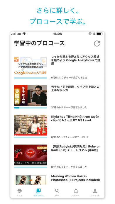 プロコースでは、より深い学習が必要なトピックを長尺の動画で学べます。動画はダウンロードしてオフラインでも視聴できるため、通勤や通学時間を使って効率的に学習を進めることが可能です。