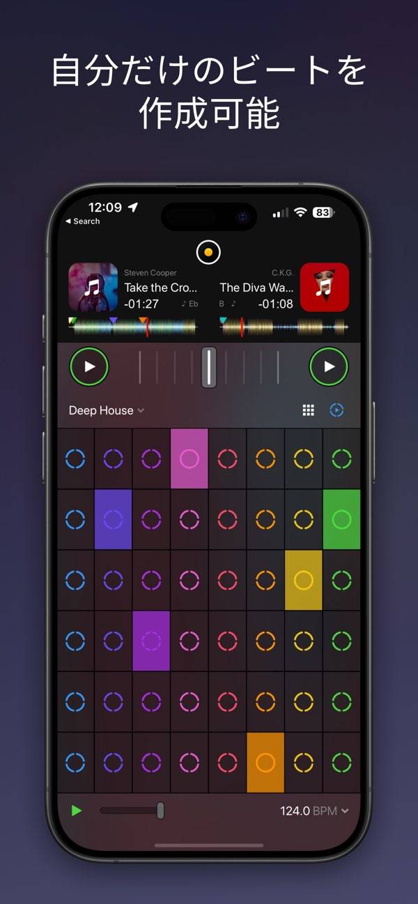 - ワンタップで2曲のBPMを同調。誰でも自然なミックスができる