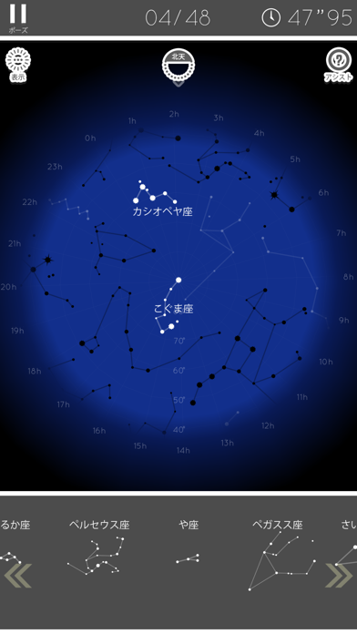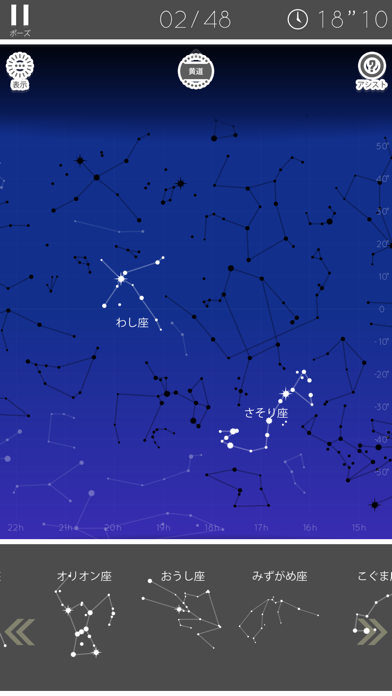 黄道12星座・トレミーの48星座・88星座の3つのモードがあります。星空が描かれたボードの中から各星座の位置を見つけ、パズルのようにはめていく仕組み。もしわからなければ「アシスト」をタップすれば位置を示してくれるので、無理なく取り組めますよ。