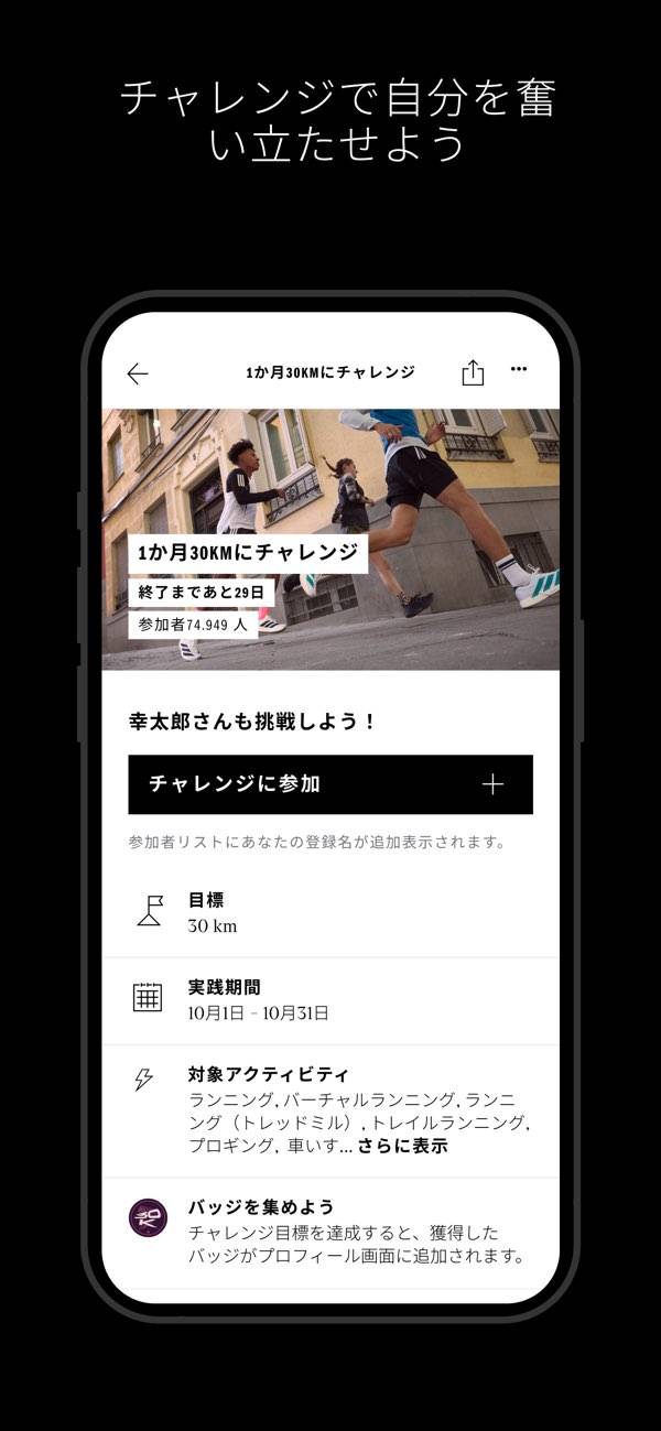 アプリ上で他者と競い合い、モチベーションを高められる機能があります。「1ヵ月50km」「1ヵ月30km」など、期間と目標が決められたチャレンジに参加し達成するとバッジを獲得。ランキングも掲載されるため、楽しみながらトレーニングを続けられるでしょう。