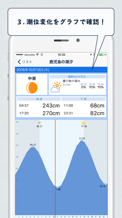 潮の動きをひと目で把握できるタイドグラフで上げ潮や下げ潮のタイミングが一目瞭然。釣りのタイミングを見極めるのに非常に役立ちます。満潮や干潮の時間、日の出や日の入り、天気などさまざまな情報が1つの画面で見られるので便利。