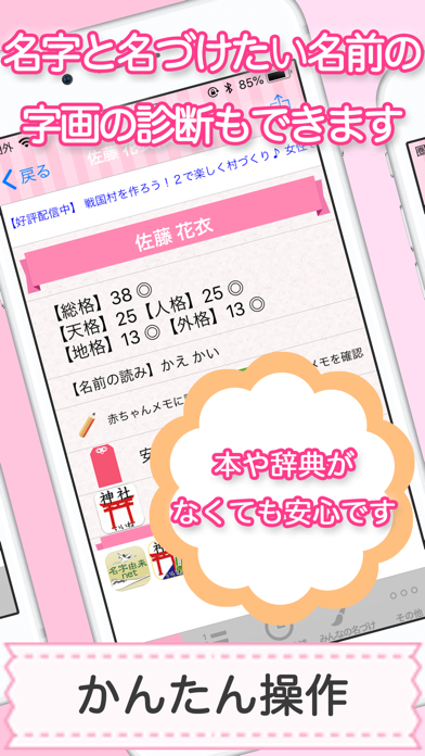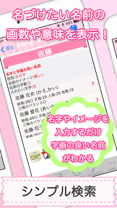 苗字を入力するだけで、数万種類の名前の中から字画が良い名前をご提案。名前のイメージや入れたい文字、名前のよみで名付けを考えることもできます。本アプリを活用することで、子供にふさわしい名前を見つけられるでしょう。