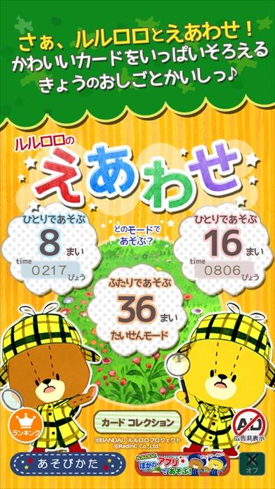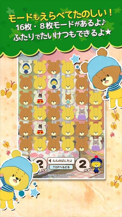 絵本シリーズ「くまのがっこう」のくま「ルルロロ」の絵合わせゲーム。神経衰弱のように、タップでカードをめくって同じ絵柄のペアを作っていきます。親子で遊べる「たいせんモード」なら、お子さんと一緒に絵合わせを楽しめますよ。シンプルながら適度に頭を使うので、知育ゲームとして最適です。