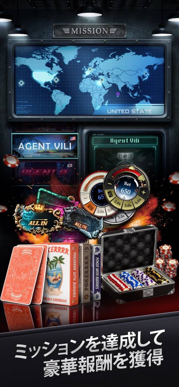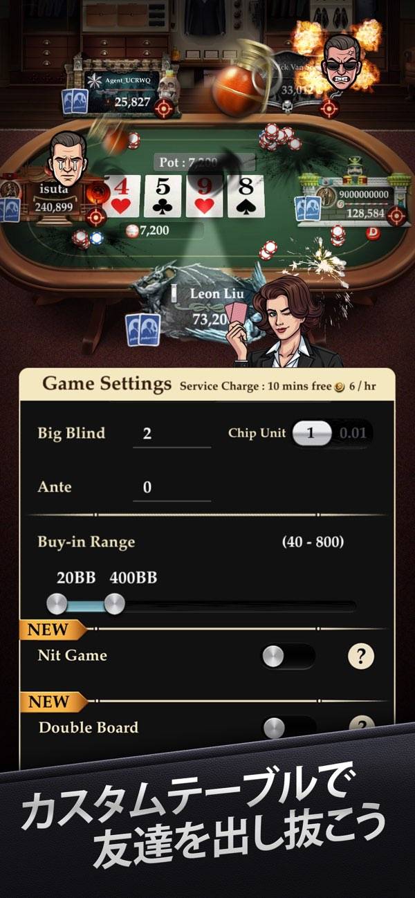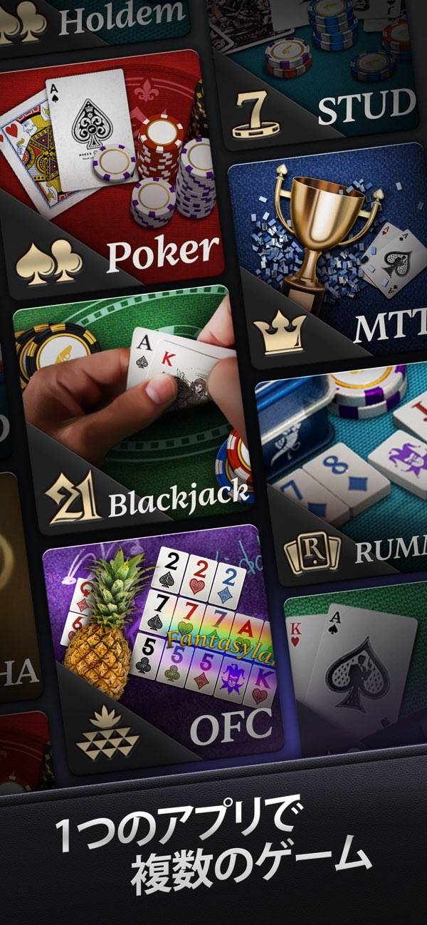 ブラックジャックやポーカーなどで遊べる、オンラインカジノゲームです。ゲームは7種類あり、それぞれ遊び方説明が見られるため、初めてプレイする人でも安心。世界中のプレイヤーとランダムマッチするモードと、ルームを作成して友達と遊ぶモードが選べます。