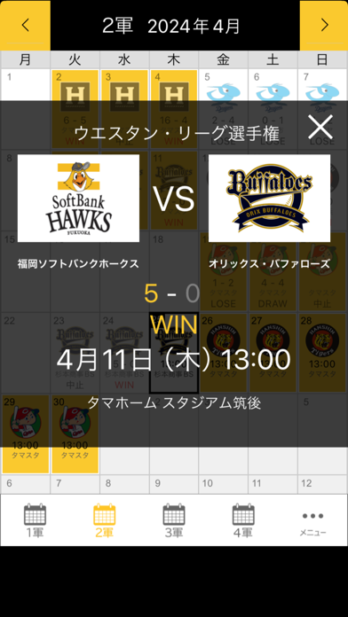 1軍だけでなく2軍から4軍まで、すべての試合予定がカレンダー上で確認可能。アプリは簡単に操作でき、次の試合の日程や対戦相手を知ることができます。開始時間や試合が開催される球場もわかるので、観戦計画が立てやすくなります。