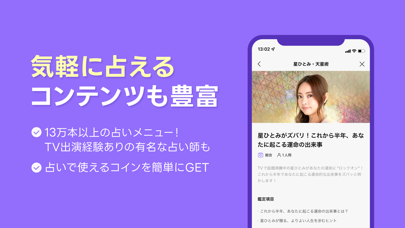 占いの種類が豊富で、自分の悩みに合わせて相談できるのが良い点。結果も分かりやすく、特に星座占いは昔から本当に当たる!デザインがかわいいので、使っているだけで癒されます。