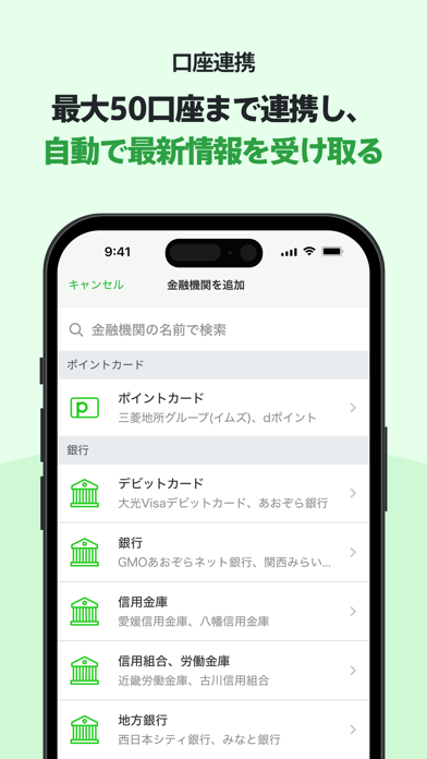 - 口座・カード・電子マネー・ポイントをまとめて表示。残高や明細が見やすい