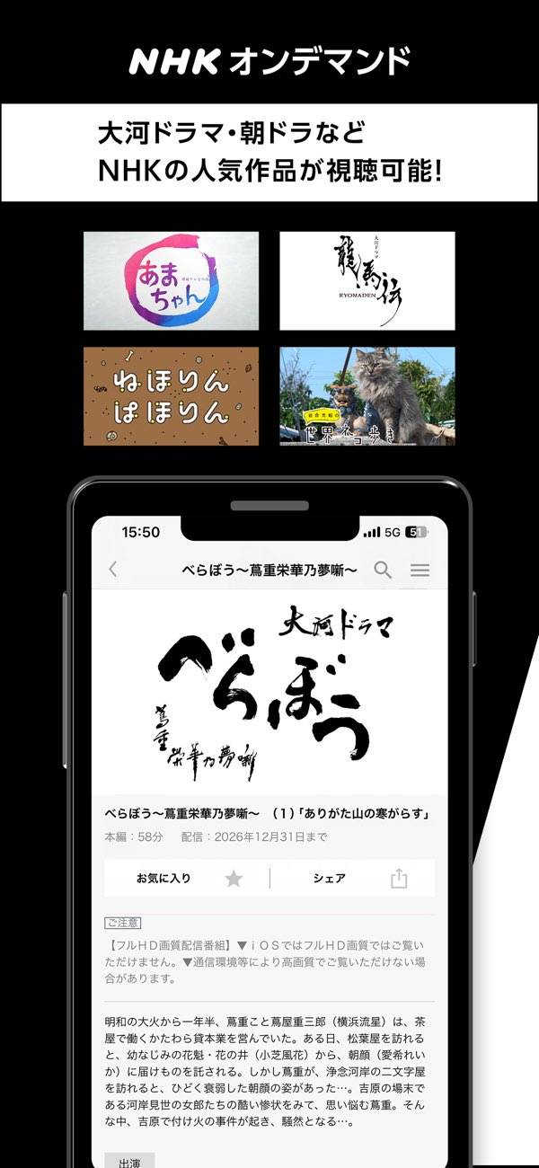 NHKが放送した10,000本以上の番組を視聴できます。ドラマやドキュメンタリー、エンタメ番組など、最新番組から過去の名作まで! 幅広いコンテンツを楽しめます。見逃したときや時間があるときに自分のペースで視聴できるのでとても便利ですよ。