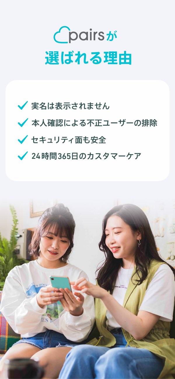 約5年前に登録し、約3ヶ月程使用しました。結婚前提での出会いを求めていたのですが、pairsがきっかけで今の主人は出会うことができました。アプリを使用しなければ、日常生活で決して出会うことがなかったと思うので、pairsにとても感謝しています。中には、不誠実な使い方を目論んでいる人もいるかもしれませんが、真剣な出会いを求める方が大半だと思うので、登録を迷われている方がいましたら、思い切って勇気を持って使い始めてみて欲しいです!