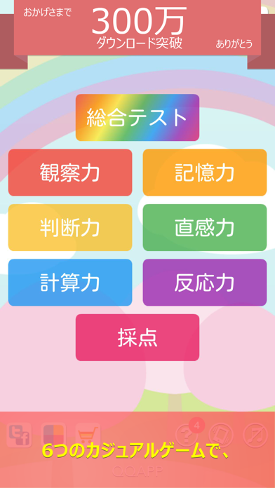 観察力や記憶力、直感力などタイプ別+総合テストという項目別メニューが用意された脳トレアプリ。こういうのは暇つぶしにちょうどいいですね。自分の結果はツイッターに投稿できちゃいます。