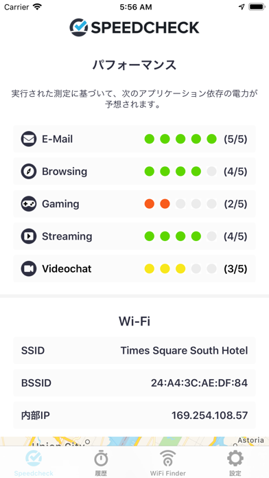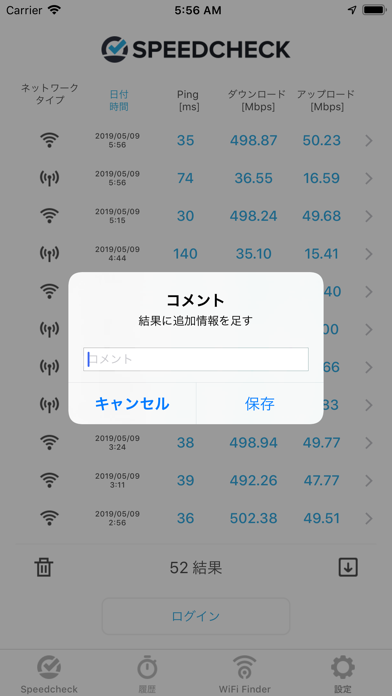 過去のテスト結果が履歴に保存され、いつでも参照可能です。これにより、どの場所でどのような通信速度が出ていたのかを後からチェックできます。またGPS機能によって計測場所も表示。場所ごとの通信速度を比較するのにも役立ちます。