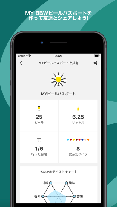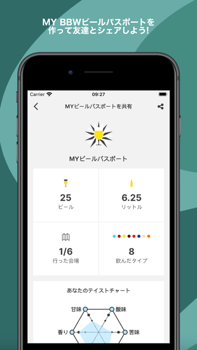 会場で飲んだビールの感想を記録できます。星による5段階評価や一言メモを残し、自分の好みの傾向を把握していきましょう。記録ページでは【甘味】【酸味】【苦味】【コク】【キレ】【香り】の6項目による分析を、レーダーチャートで表示してくれます。