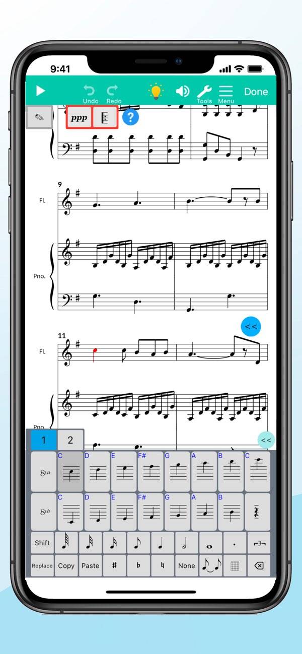 アイデアが浮かんだ瞬間に、すぐ楽譜へ入力できます。音符用やコード用のボタンがキーボードのように並んでいるので、フリック感覚でテンポよく打ち込みが可能。拍子や調号の変更もワンタップでできる手軽さです。面倒なズームやパレット操作がなく、すきま時間にサクッとメロディを記録しておけます。