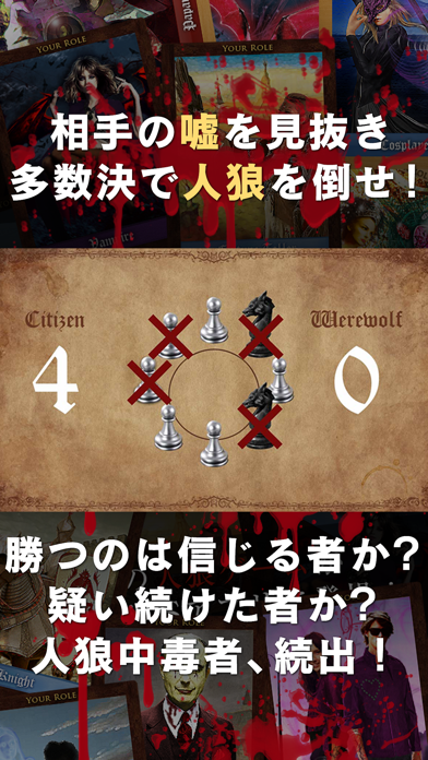 市民になりすまし、毎晩1人ずつ市民を喰い殺していく人狼。このゲームは「人狼を処罰したい市民」と「市民を1人残らず喰いたい人狼」という2勢力の戦いを描いた心理戦ゲームです。