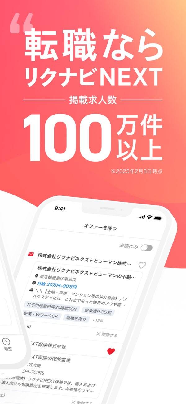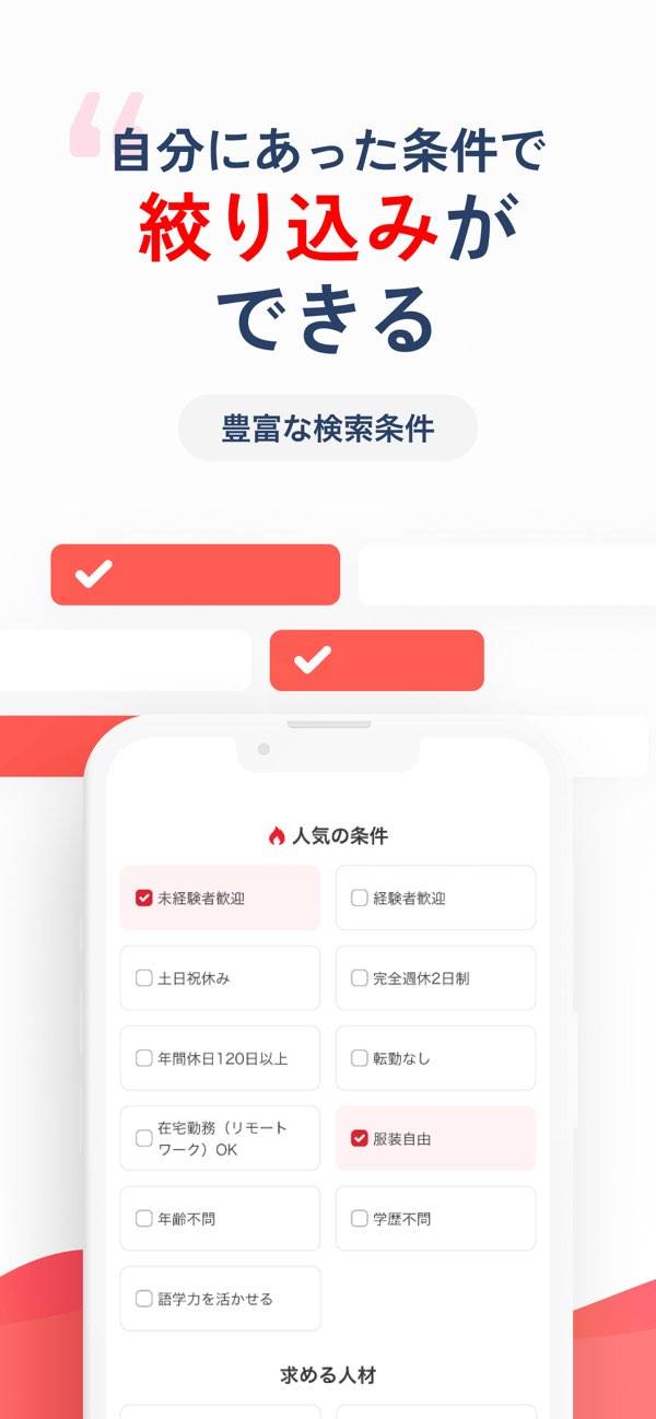 大手からベンチャーまで、幅広い求人数が魅力の転職アプリです。休暇の特徴や働き方に応じたこだわり条件で絞り込みが可能。希望条件を登録すると、タイムラインで求人情報をチェックできます。