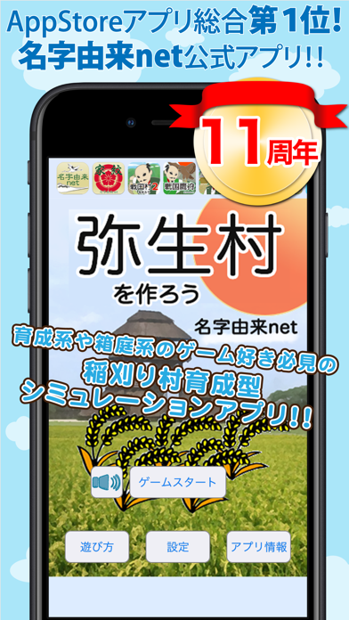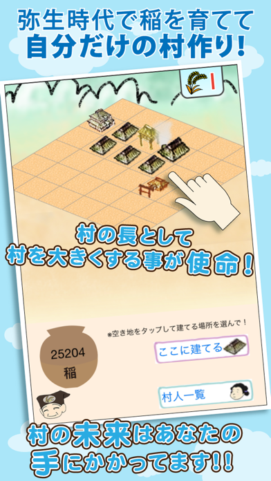 ゲームの目的は人口を増やしたり、稲を育てることで村を大きくしていくこと。稲を収穫してポイントを貯め、貯めたポイントで竪穴式住居や武器を購入して侵入者から村を守ったりして育てていきます。ゲームの要ともなる稲は放置しておけば勝手に育つので、基本放置して回収していけばゲームは進みます。