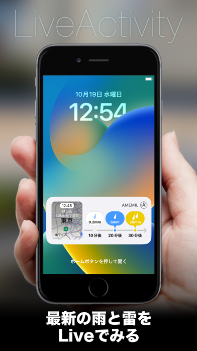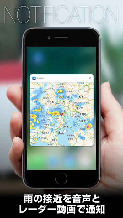 周囲10km以内の雨雲にカメラを向けると、どれくらいの降雨量が予想されるかアニメーションで表示。雨音も再生されるため、目と耳の両方で規模を把握できます。