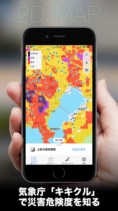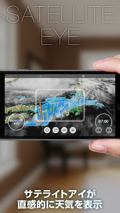 - 2D・3D、上空から天気を俯瞰する「サテライトアイ」の3つのモードを搭載