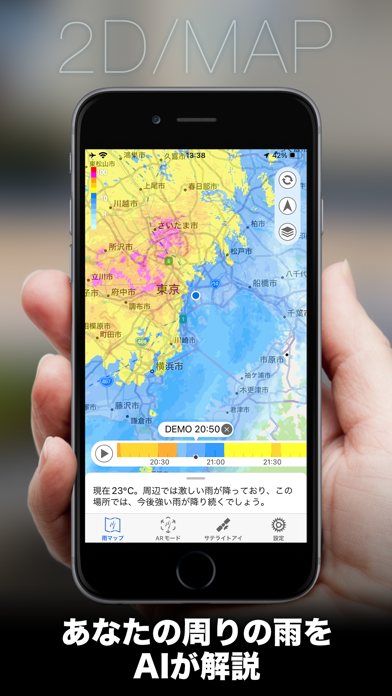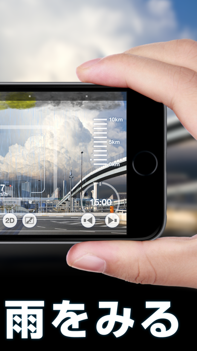 雨雲や降雨情報を、2D・3D両方でチェックできるお天気アプリ。類似アプリでもよく見る雨雲レーダーのほか、AR機能で降雨の様子を眺められるのが最大の特徴です。