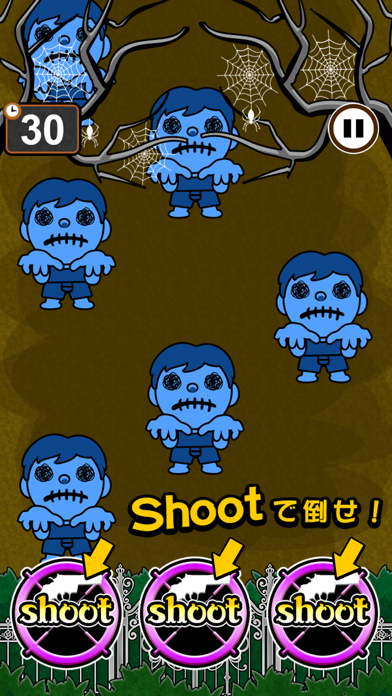 「左」「真ん中」「右」とそれぞれ対応するボタンがあるので、最前列にいるゾンビの場所によって押すボタンを変え、テンポよくタップしスコアを稼いでいきましょう。30秒間の制限時間の間にどれだけ多くのゾンビを倒せたかで得点が変動します。