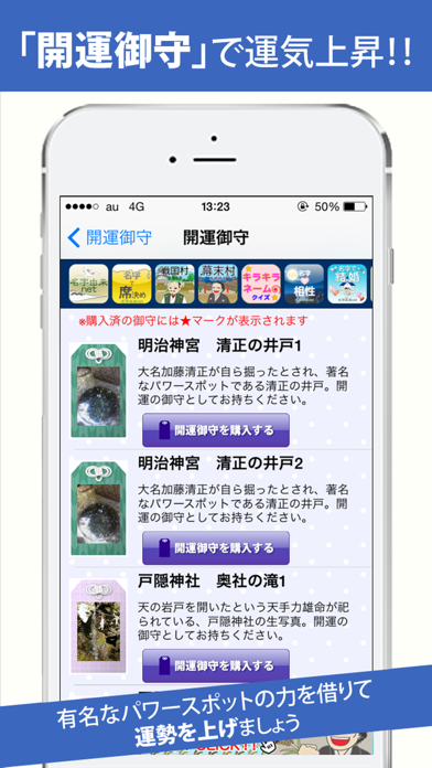 - 待ち受けなどにすると縁起がいい開運お守りがアプリ内で購入できる