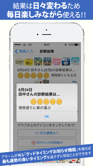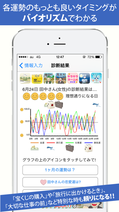 大事な決断をする時に最適なタイミングがわかる運勢診断アプリです。使うのは名字だけ。名字と性別を入力すると、早速診断を開始。「金運」「旅行運」「仕事運」「勝負運」の4つの運勢のバイオリズムを、グラフで表示。最もよいタイミングが時間でわかります。