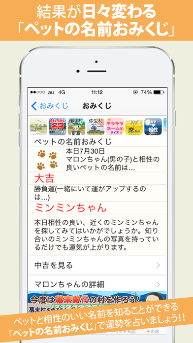 毎日の運勢をおみくじ形式で確認できる機能が楽しいです。今日一日、自分のペットと相性のいいペットの名前を提示してくれます。「今日一日、成功運がアップするのはセサミちゃん」「運気がダウンするのはくうちゃん」という感じです。