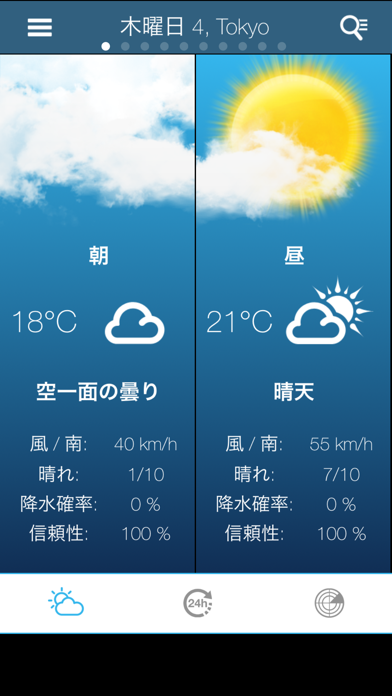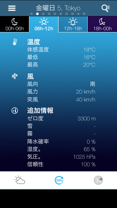 毎日の天気予報をサッと確認できます。アプリを開いてすぐに、現在とその後の天気予報が画面一杯に表示されます。天気や気温に加え、降水量や風の情報まで掲載。さらに画面下部の24hをタップすれば、6時間ごとのさらに詳しい情報を確認できます。